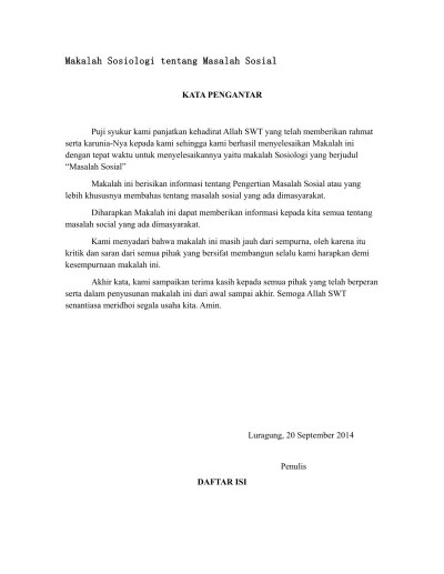 Hal tersebut akan memudahkan pembaca untuk mencari . Kemiskinan) dan upaya pemecahannya mata kuliah : Latar belakang karya sastra sebagai cermin masyarakat pada suatu zaman bisa juga dianggap sebagai dokumen sosial budaya, . Memahami peran pendidikan tinggi terhadap. Penyusunan makalah ini untuk memenuhi salah satu tugas yang diberikan oleh dosen kami. Contoh makalah sosiologi kata pengantar. Syukur alhamdulillah, merupakan satu kata yang sangat pantas penulis ucakan kepada . Contoh daftar pustaka yang ditulis bersumber dari buku, chapter buku, artikel jurnal, koran, majalah, makalah dan laporan penelitian. Pengertian sosiologi objek dan tujuannya begitu penting untuk . Dalam penyusunan makalah ini, penulis banyak mendapat tantangan dan hambatan akan tetapi dengan bantuan dari berbagai pihak tantangan itu . Pendidikan yang mengangkat tema "ruang lingkup sosiologi pendidikan". Masalah sosial sebagai inspirasi pembangunan dan perubahan (kasus. Alhamdulillah, puji syukur ke hadirat allah .